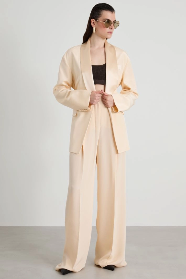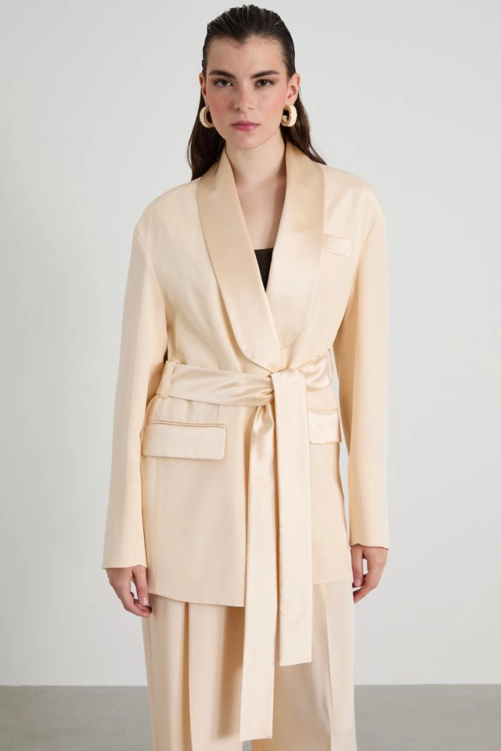Deconstructed straight-fit blazer in pure silk crepe de chine, with satin shawl collar, long sleeves with buttons, chest welt pocket and double-welt side pockets with flap. Central vent on the back and fastening with a matching belt. Partially lined.