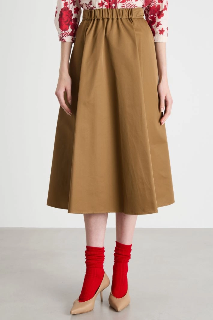 Full skirt in cotton-blend gabardine, with an elasticated insert at the waist, button tabs at the sides and French pockets.