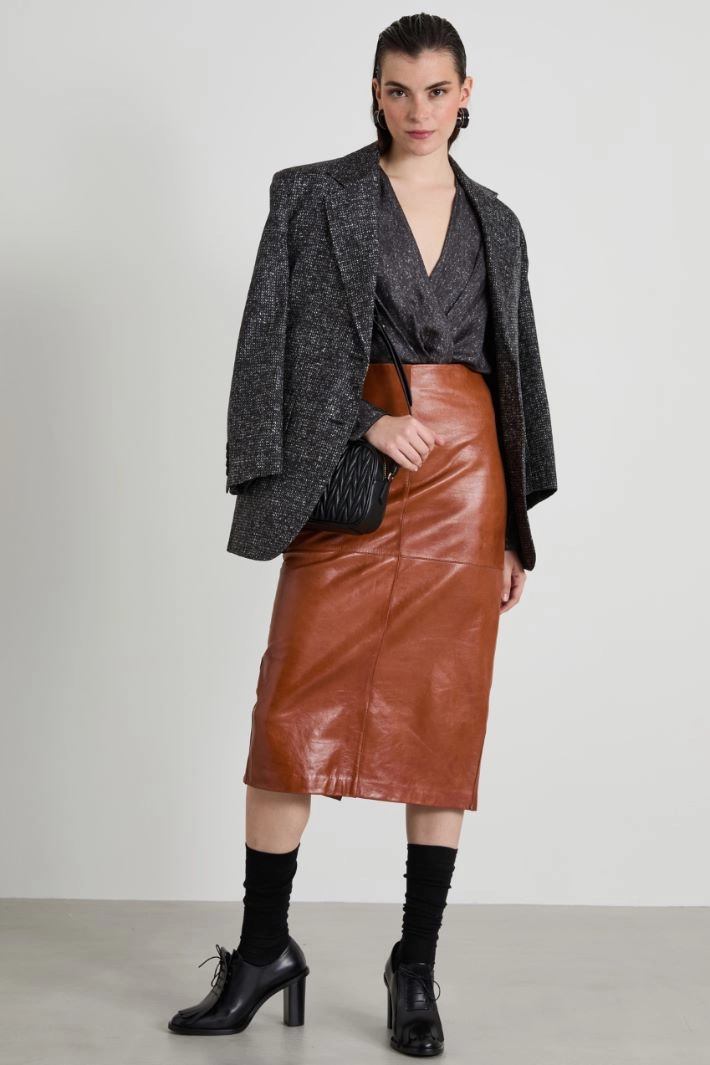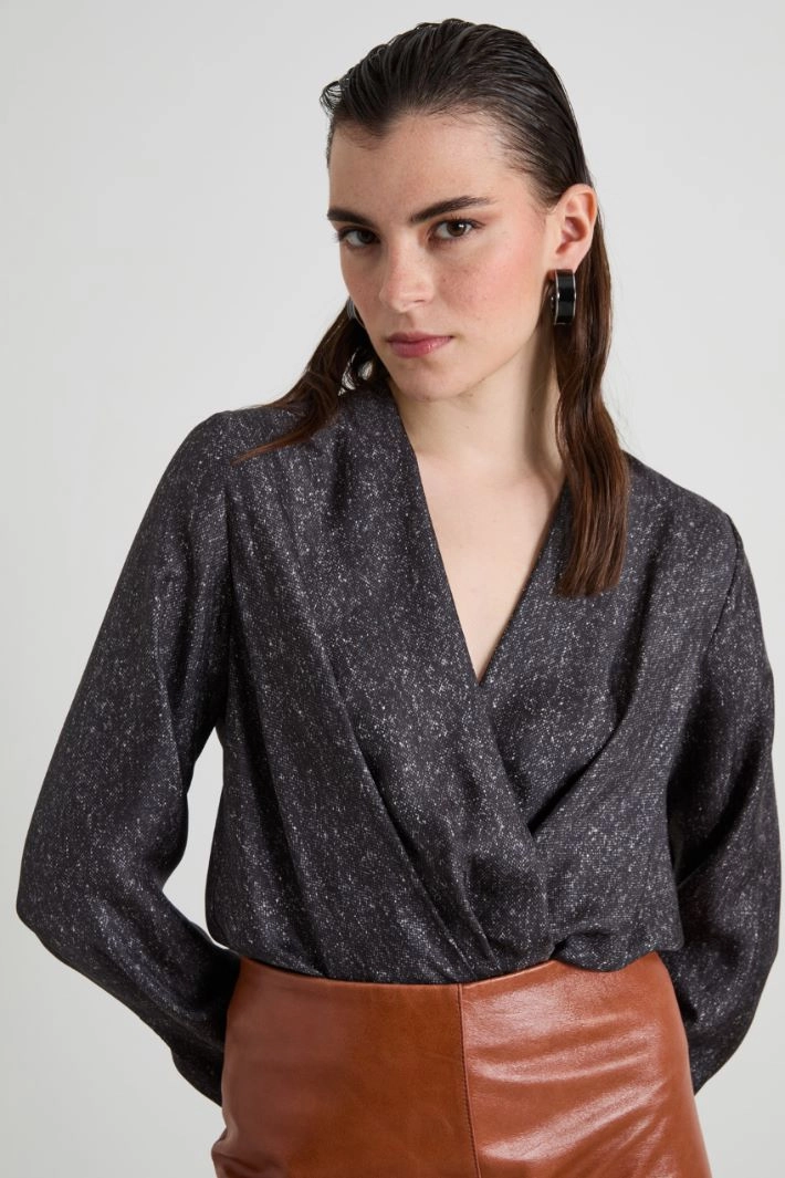 Flowing bodysuit in printed pure silk twill, with crossed V-neck, long sleeves with twin cuffs, tulle insert at the bottom and button fastening.