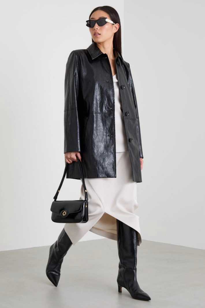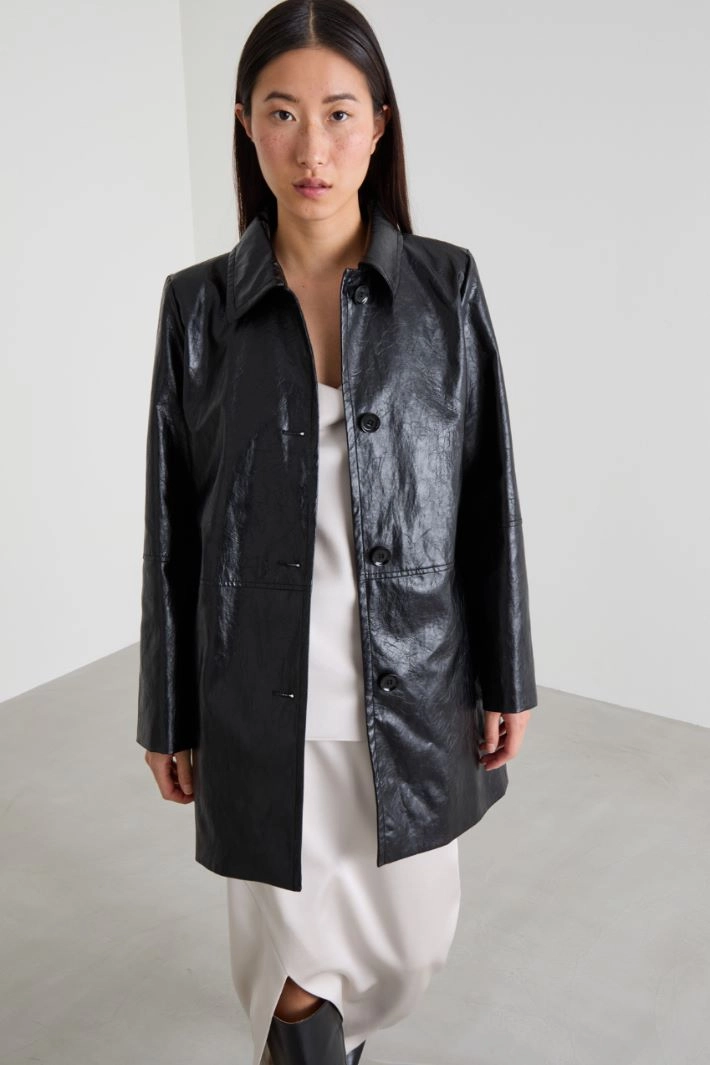 Long straight-fit trench coat in faux leather with an aged effect and a glossy finish, with a shirt collar, long sleeves and side welt pockets. Single-breasted button fastening. Lined.