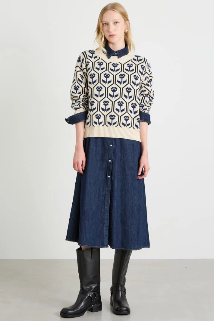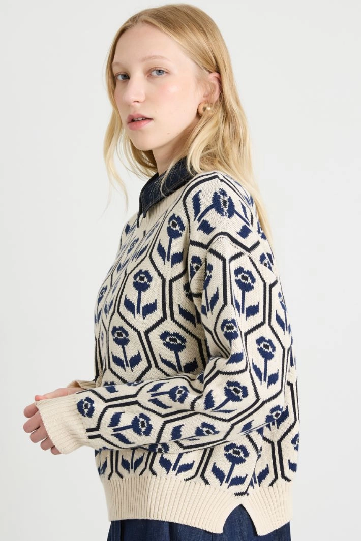 Regular-fit sweater in jacquard cotton blend yarn, with crew neck, dropped shoulders, long sleeves and side slits.
