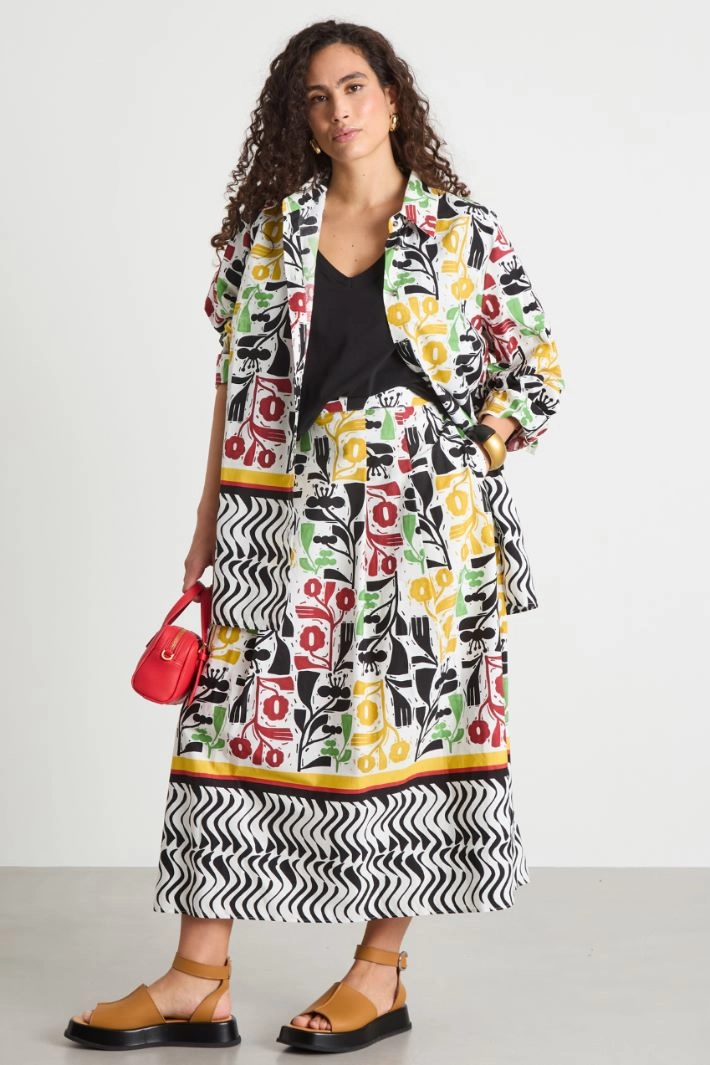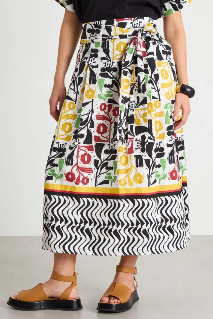 A slightly flared skirt in printed cotton, with French pockets, pleat detail, a rear zip and button fastening and a matching belt.