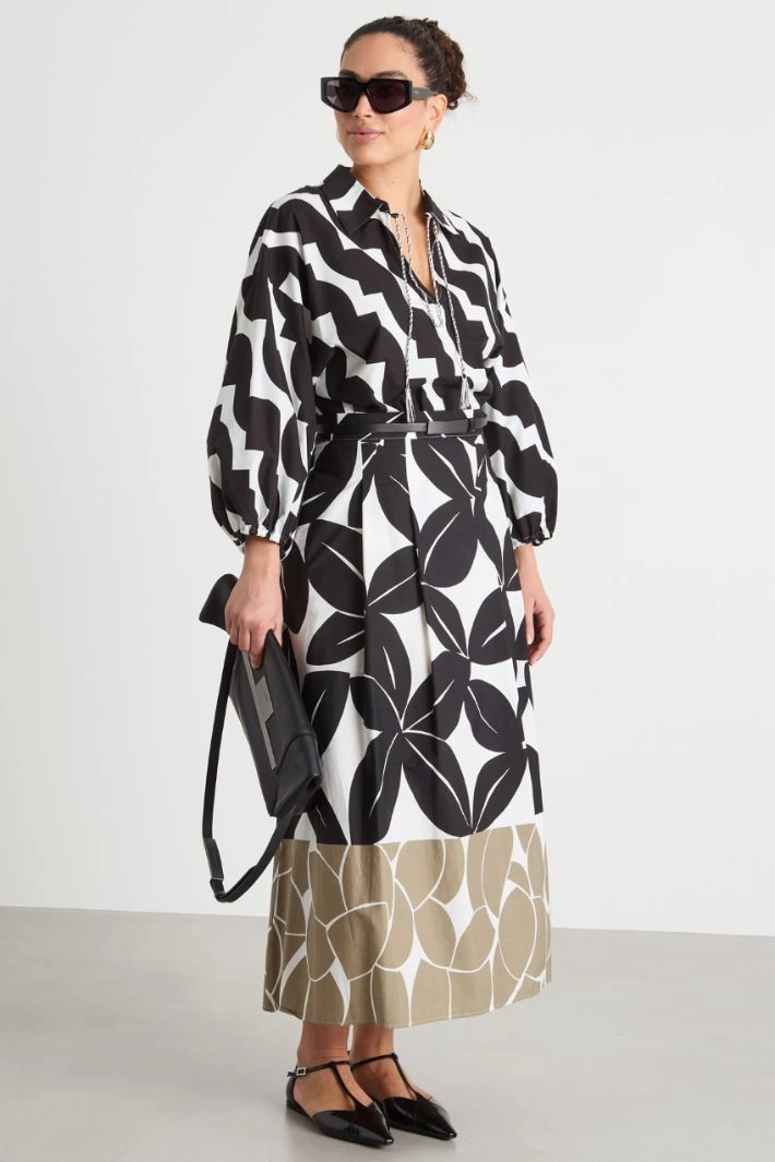 A slightly flared skirt in printed cotton, with French pockets, pleat detail, a rear zip and button fastening and a matching belt.