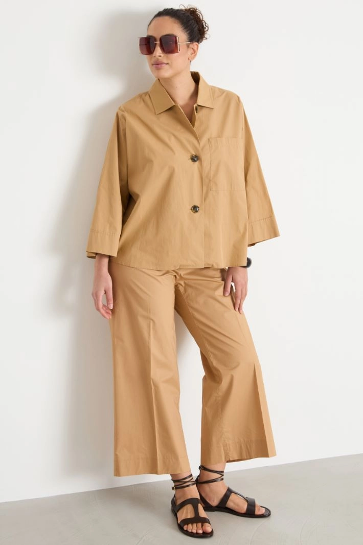 Boxy-fit shirt in pure cotton poplin, with a pointed collar, a patch pocket on the chest, three-quarter sleeves with deep cuffs and a flared hem. Button fastening.