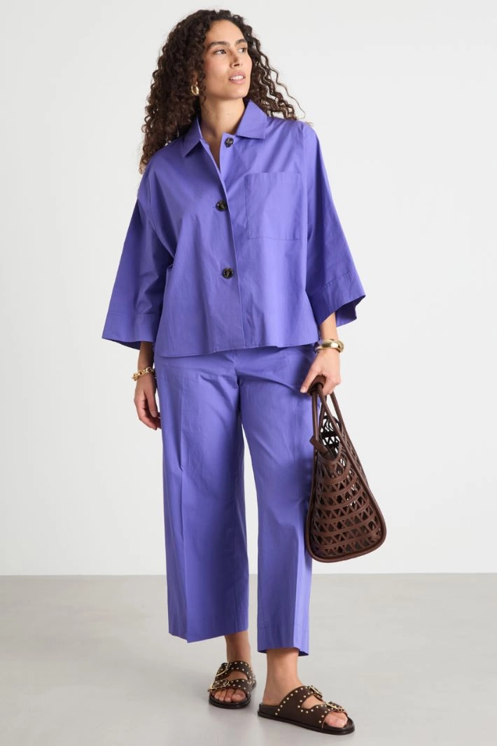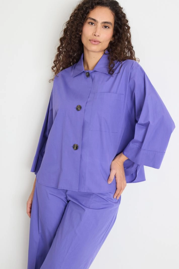 Boxy-fit shirt in pure cotton poplin, with a pointed collar, a patch pocket on the chest, three-quarter sleeves with deep cuffs and a flared hem. Button fastening.