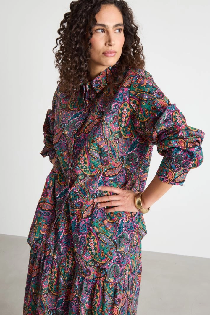 Straight-cut shirt in cotton muslin, with a pointed collar and long sleeves with cuffs and buttons. Button fastening.