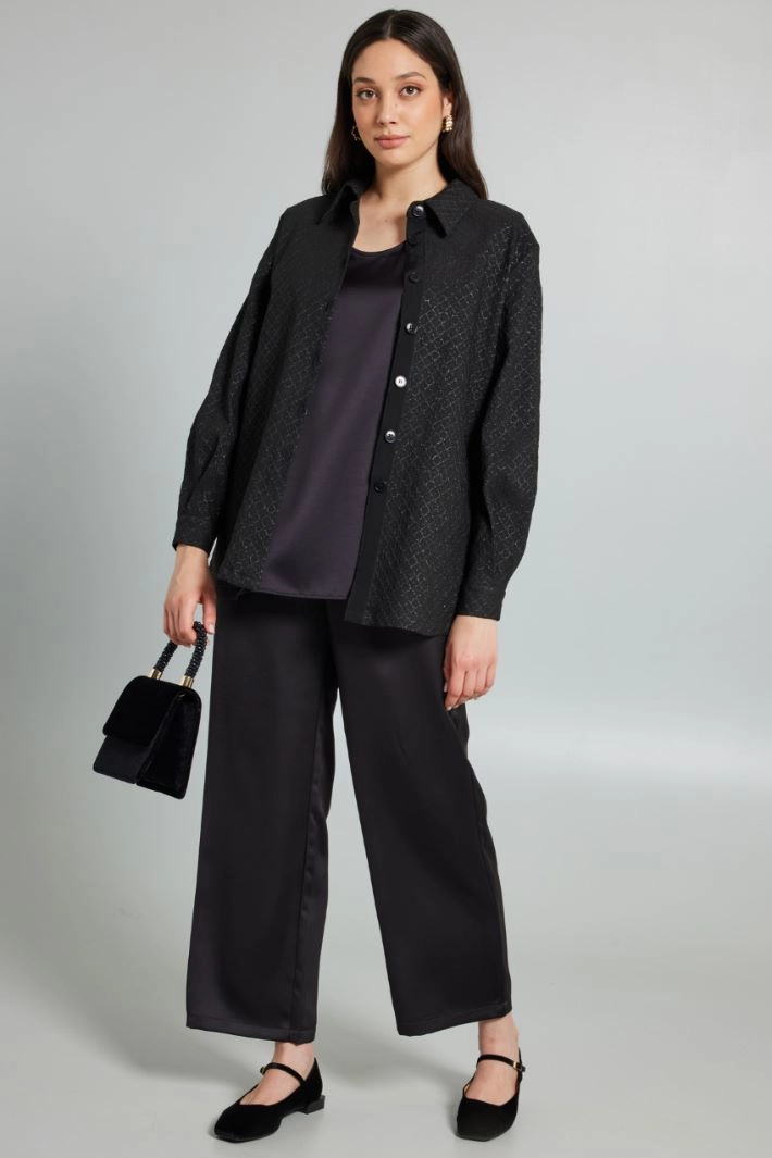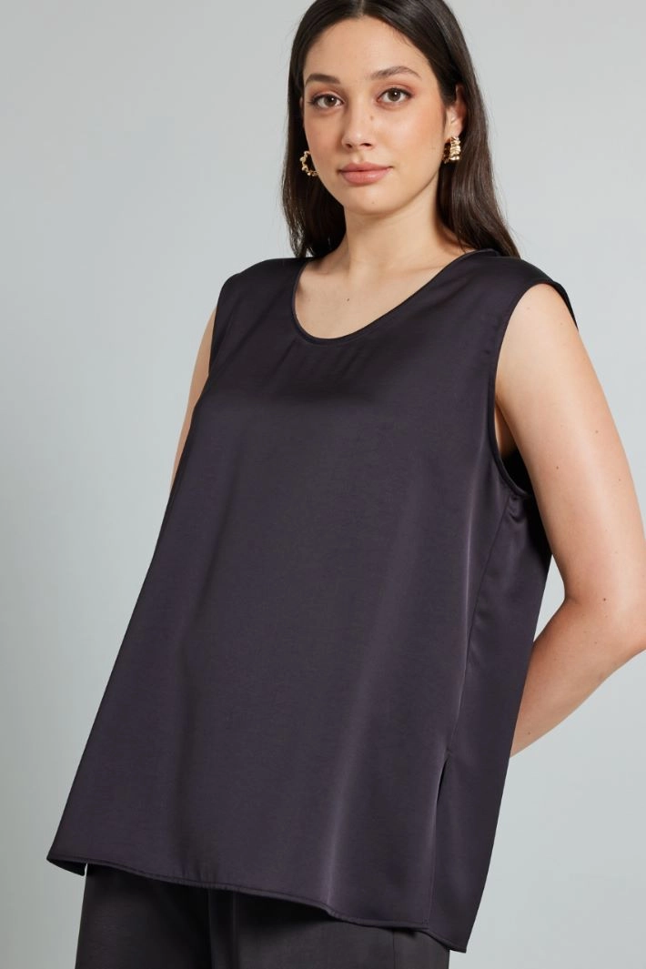 Fluid satin top with U-neck, sleeveless and side slits at the bottom.
