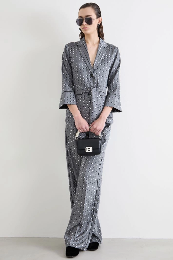 Straight-cut trousers in printed twill, with elastic waistband insert on the back, French pockets on the front, single welt pocket on the back and pressed crease lengthwise. Hidden fastening with zip, button and hook.