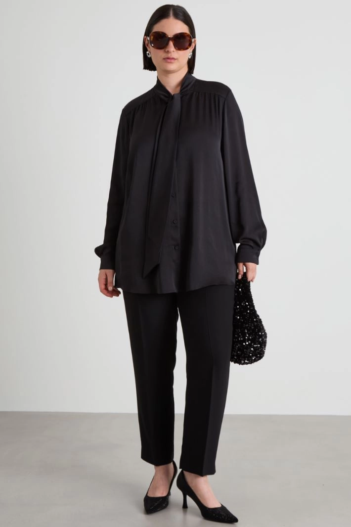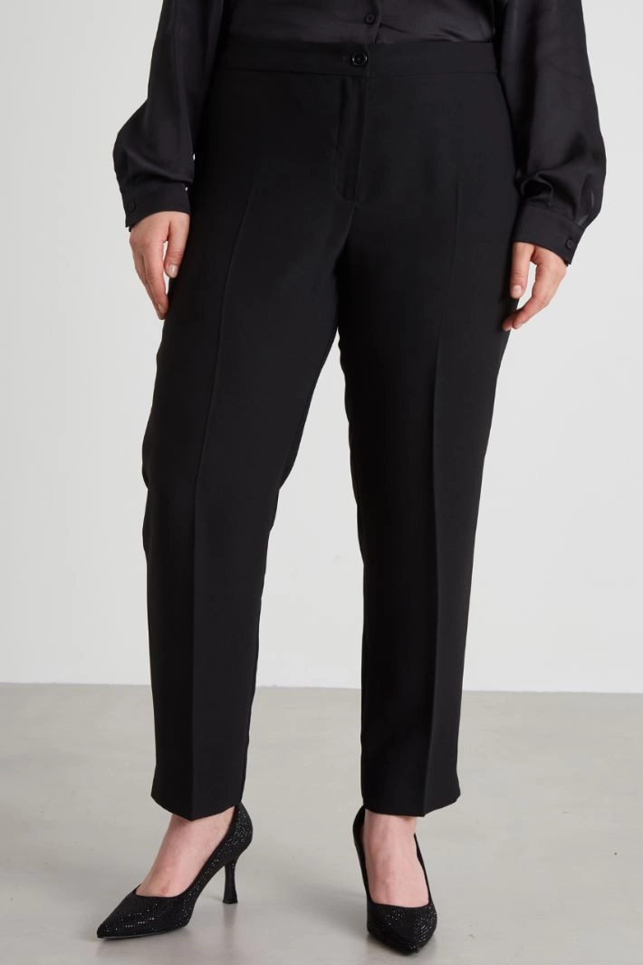 Cigarette-fit trousers in crepe envers satin, with elastic waistband insert on the back, pressed crease lengthwise and side slits at the hem. Zip and button fastening.