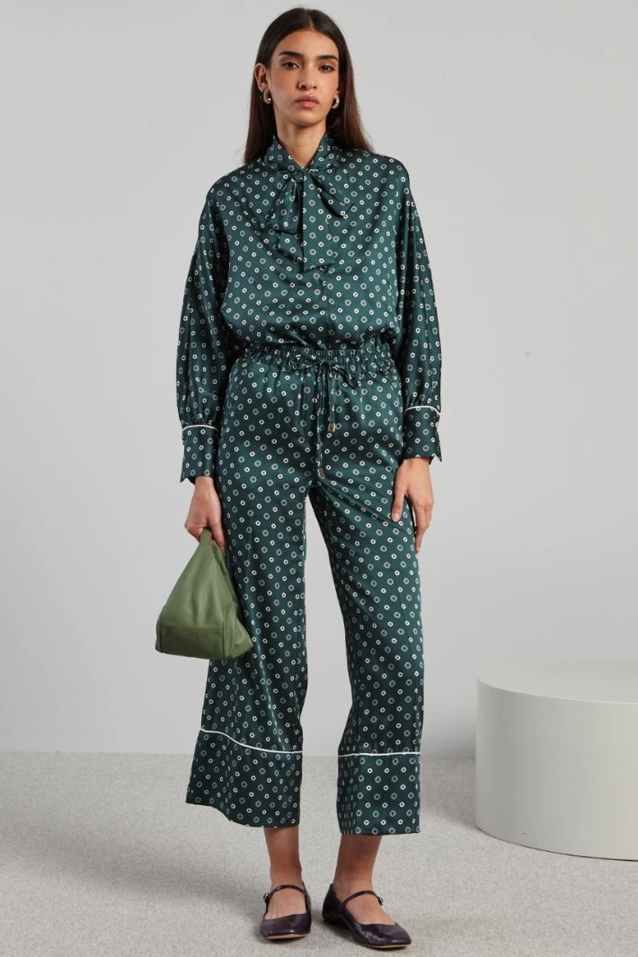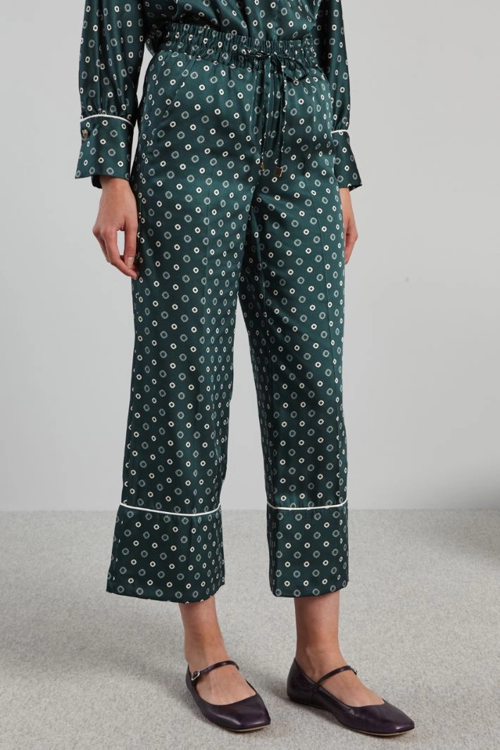 Cropped trousers with a straight and loose leg in printed twill, with drawstring waist, French side pockets and single welt pocket on the back.