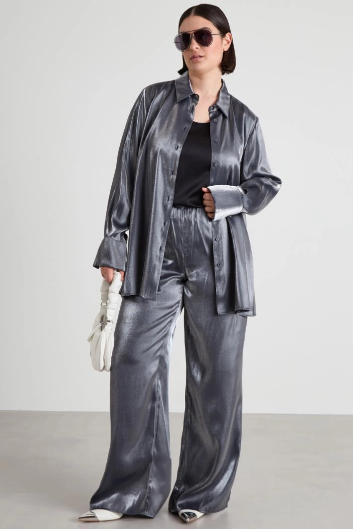 Flared shirt in laminated viscose blend fabric, with classic collar, long sleeves with slit at the wrist and visible fastening with covered buttons.