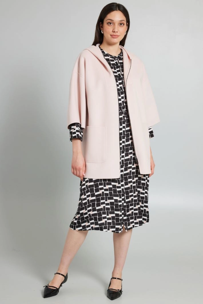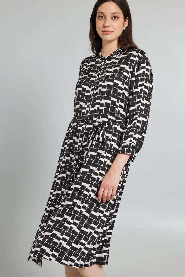 Midi fluid shirt dress in printed pure viscose twill, with Mandarin collar, long sleeves with cuff and buttons, inset side pockets, Button fastening and matching belt.