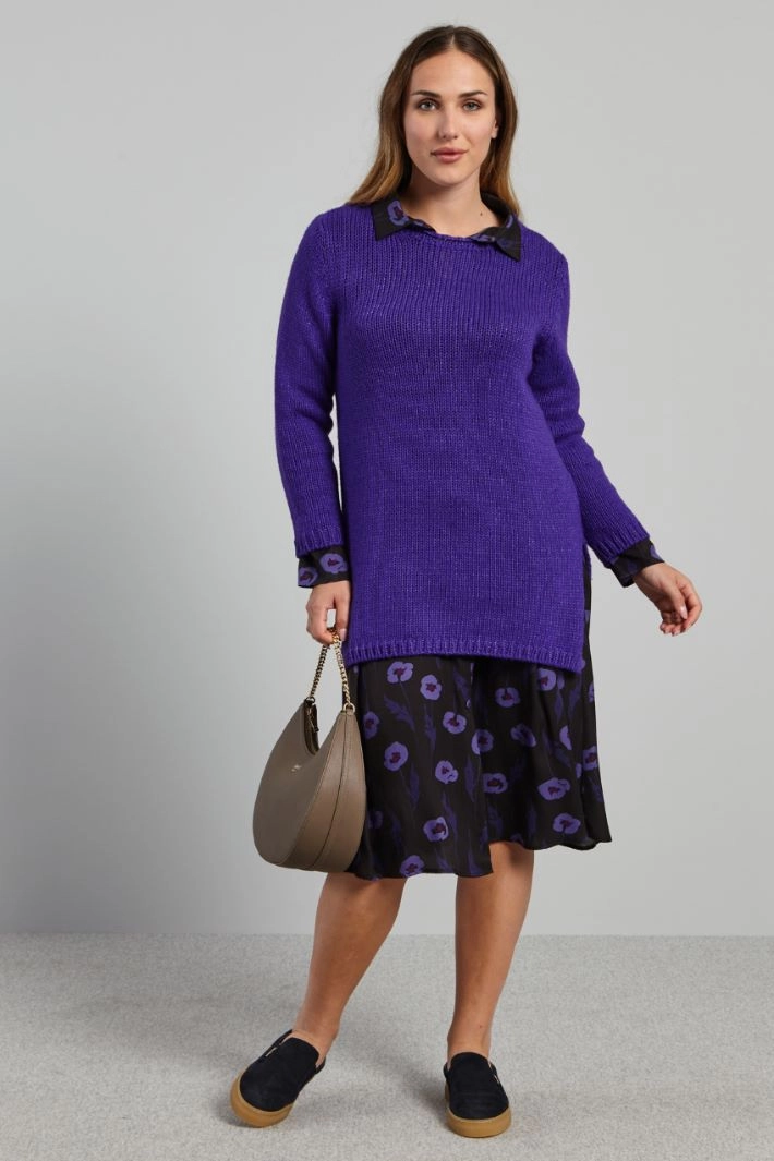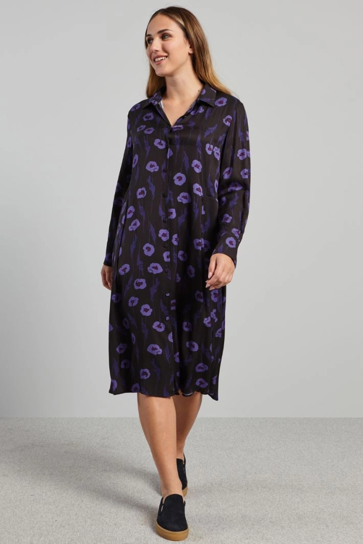 Fluid shirt dress in printed pure viscose twill, with classic collar, long sleeves with cuff and button, inset side pockets and pleats sewn at the waist. Button fastening.