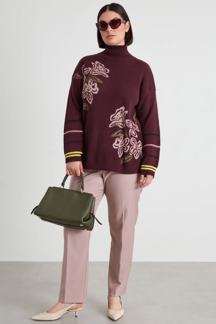 Straight-cut sweater in viscose, cotton and wool blend yarn with jacquard knit, high neck and long sleeves.