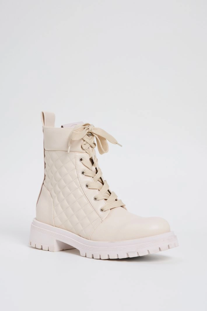 Faux leather combat boots with stitching on the sides, rounded toe, lacing with laces with metal hooks and zip on the inside. Rubber trekking sole.