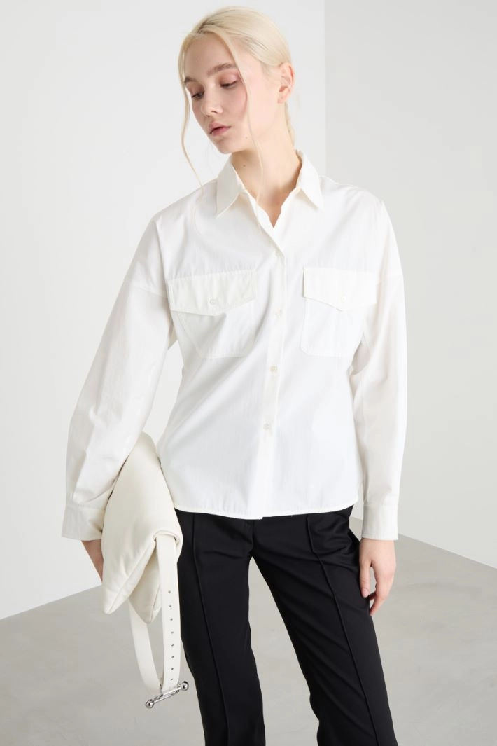 Slightly A-line shirt crafted in pure cotton poplin, with a pointed collar, long drop-shoulder sleeves, buttoned cuffs, patch pockets with buttoned flaps on the chest, and a rounded high-low hem. Button fastening.