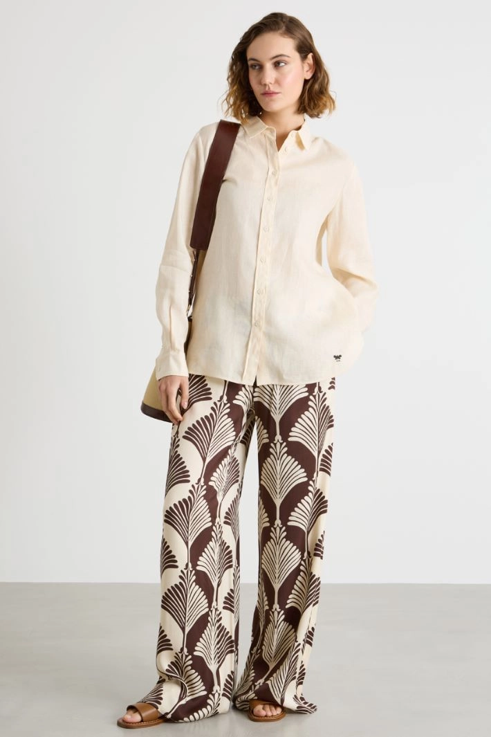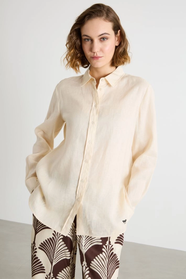 Straight-cut shirt crafted in pure linen. This piece features a pointed collar, long sleeves, a yoke with a box pleat on the back, and a rounded hem. Button fastening.