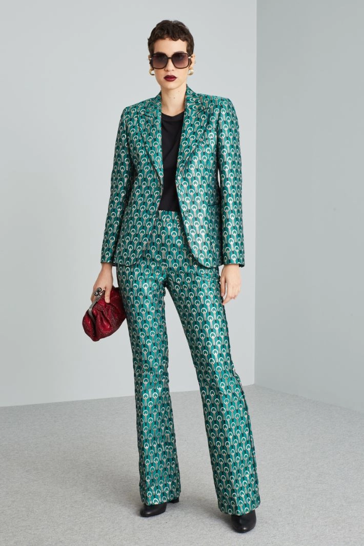 Slightly flared trousers in jacquard fabric with lurex fiber insert, waistband with belt loops, French pockets at the front and welt pockets at the back. Profiles finished with piping. Hidden fastening with zip, button and hook.