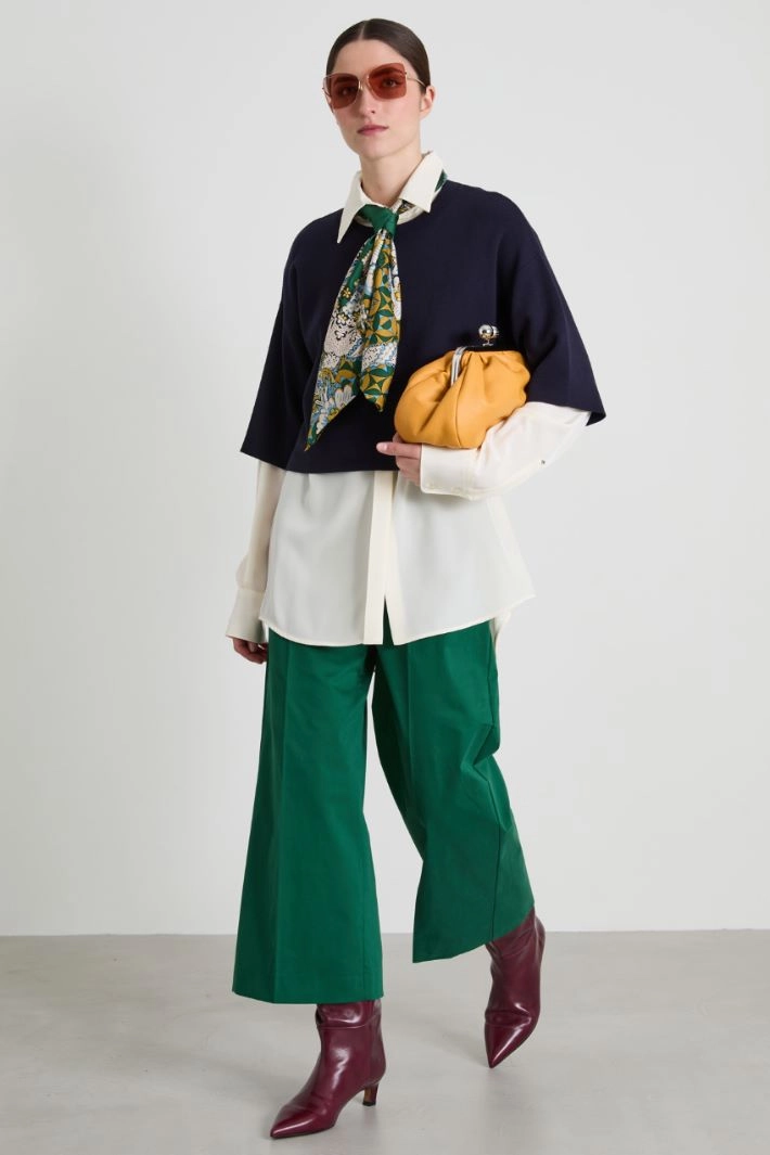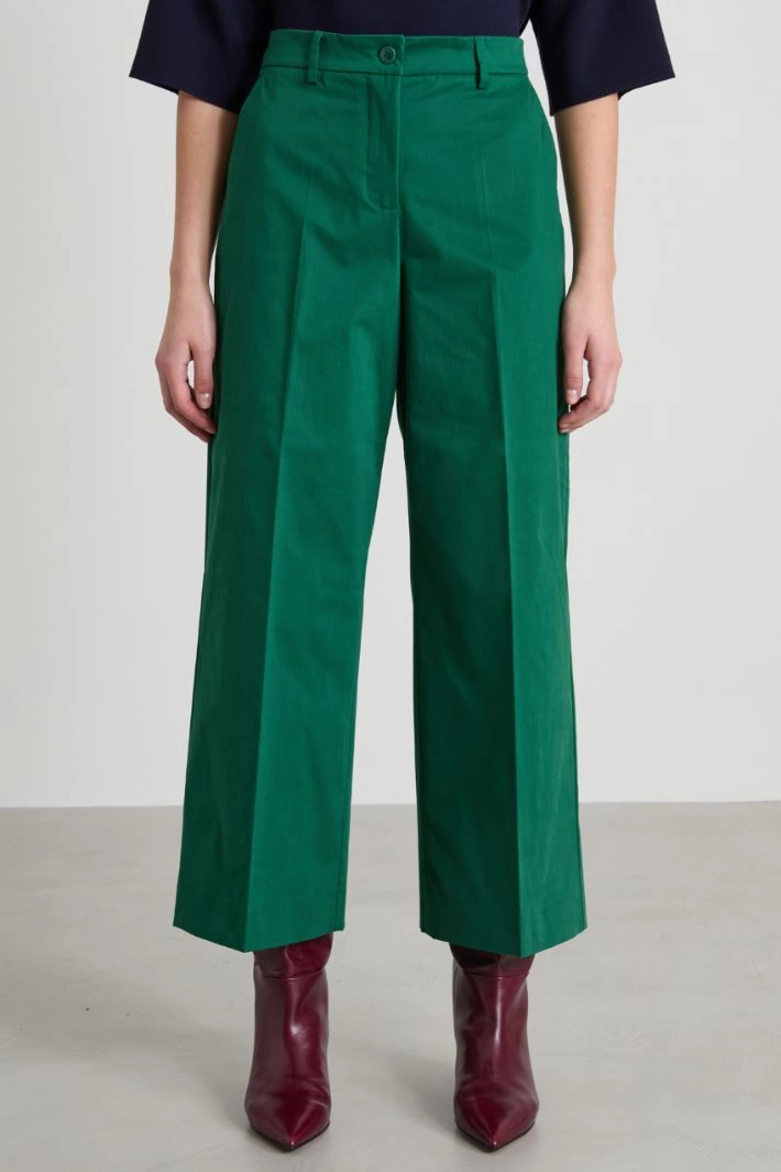 Cropped trousers with a straight and loose leg in stretch cotton satin, with belt loops at the waist, side French pockets and buttoned welt pockets on the back, and crease ironed lengthwise. Fastening with a hidden zip and button.