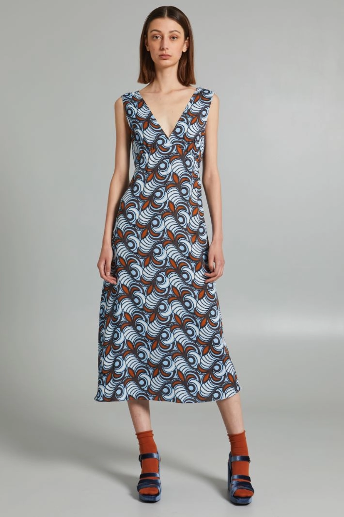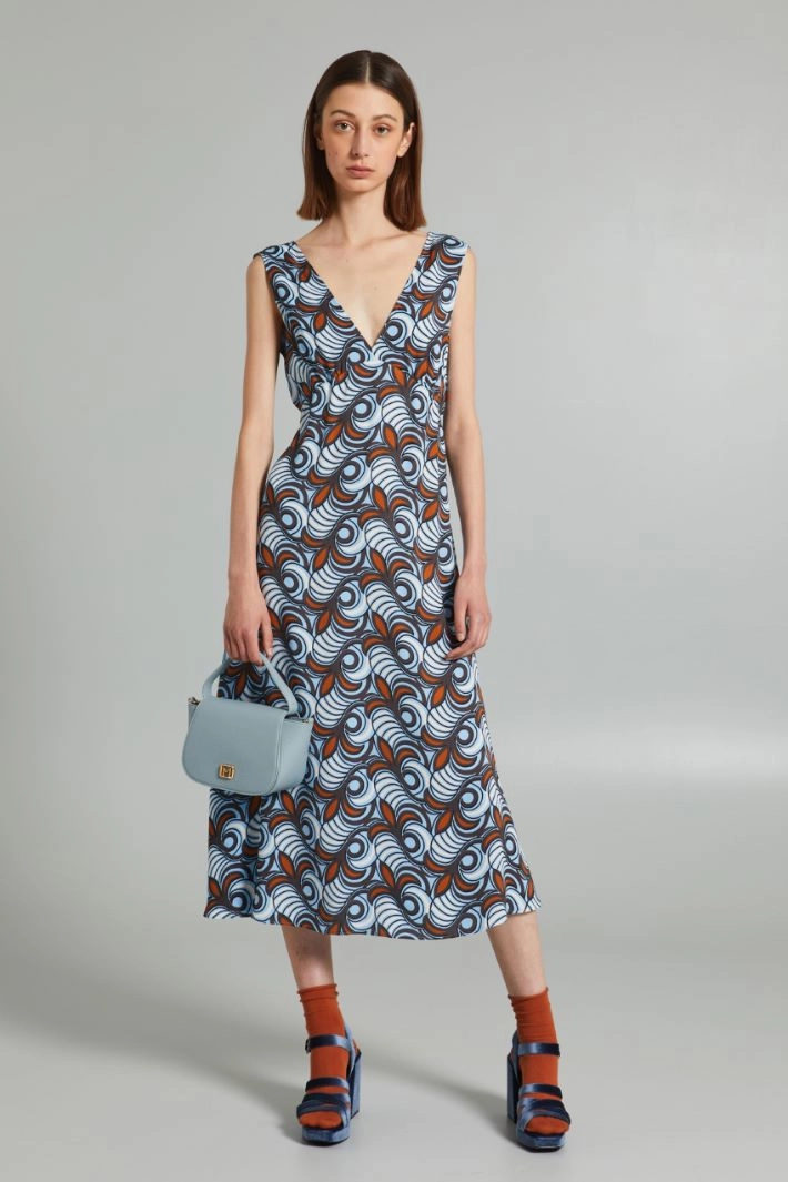 Long flowing sleeveless dress in printed pure viscose georgette, with thick straps, V-neck on the front and back, underbust cut. Invisible zip fastening on the side. Partially lined.