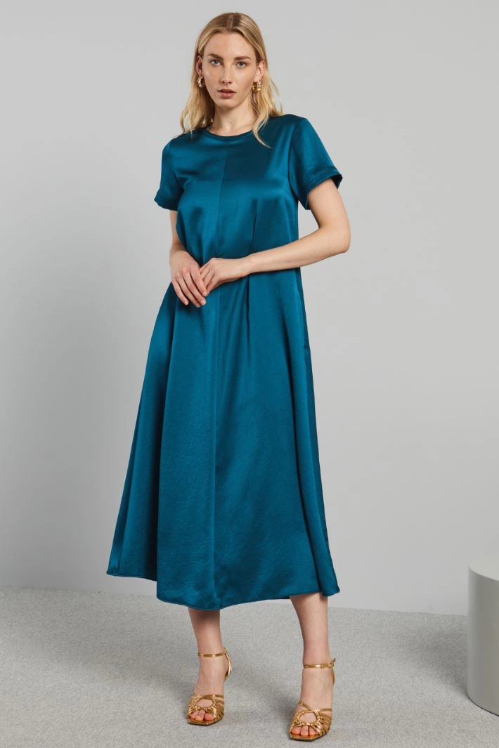 Long fluid satin dress with a round neckline, short sleeves and inset side pockets. Invisible zip fastening on the back.