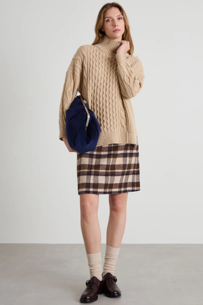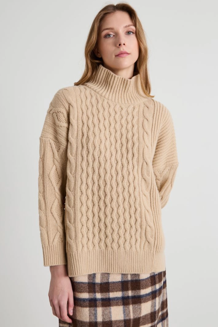 Regular-fit sweater in pure wool yarn, with raised motif on the front, high neck, long dropped sleeves and ribbed trim.