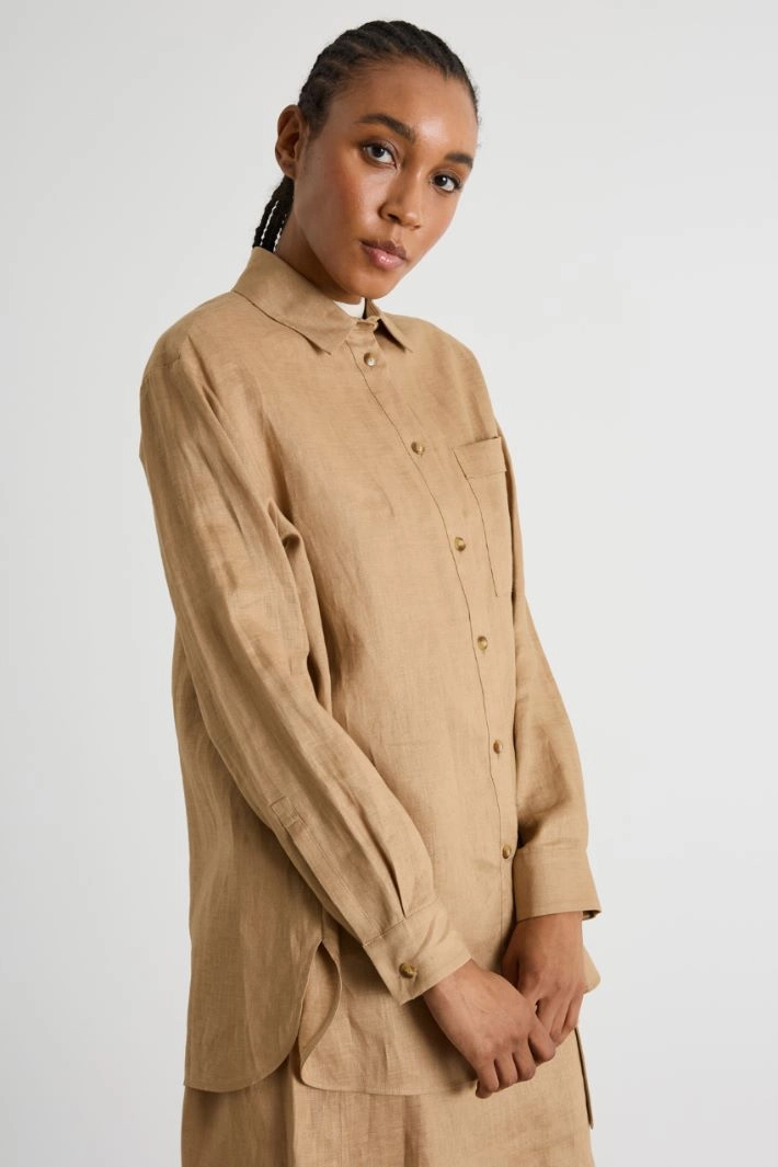 Oversized shirt crafted from pure linen, with a pointed collar, a patch pocket on the chest, long dropped-shoulder sleeves and buttoned cuffs. Button fastening.