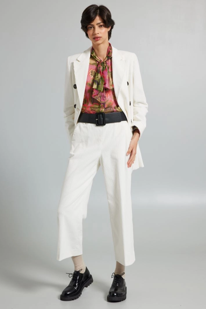 Flowing shirt in printed silk crepon with lamé fiber insert, scarf collar, long sleeves with cuff and button. Fastening with visible buttons.