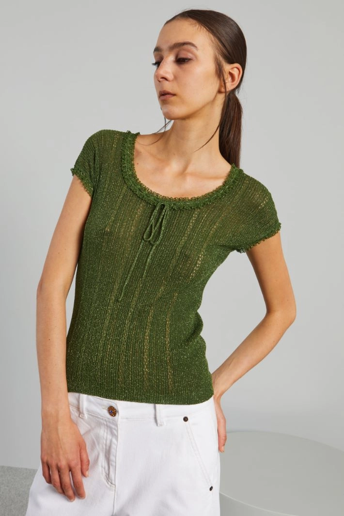 Fitted openwork top in stretch viscose blend yarn, trimmed with ties to knot at the round neckline, short sleeves embellished with a lace-effect pattern.