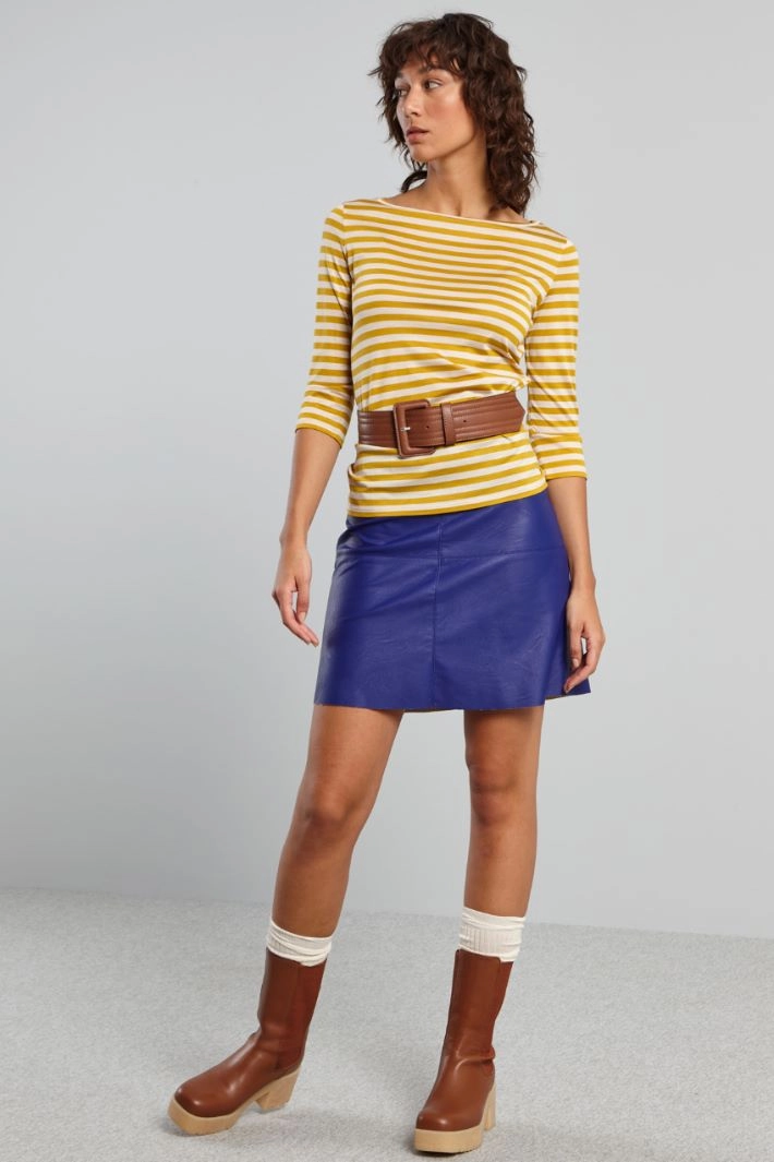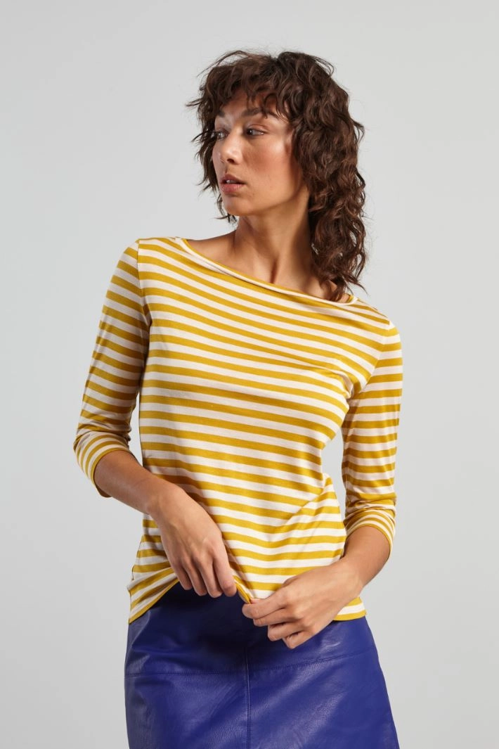 Regular fit T-shirt in yarn-dyed pure silk jersey, with boat neckline and three-quarter sleeves.