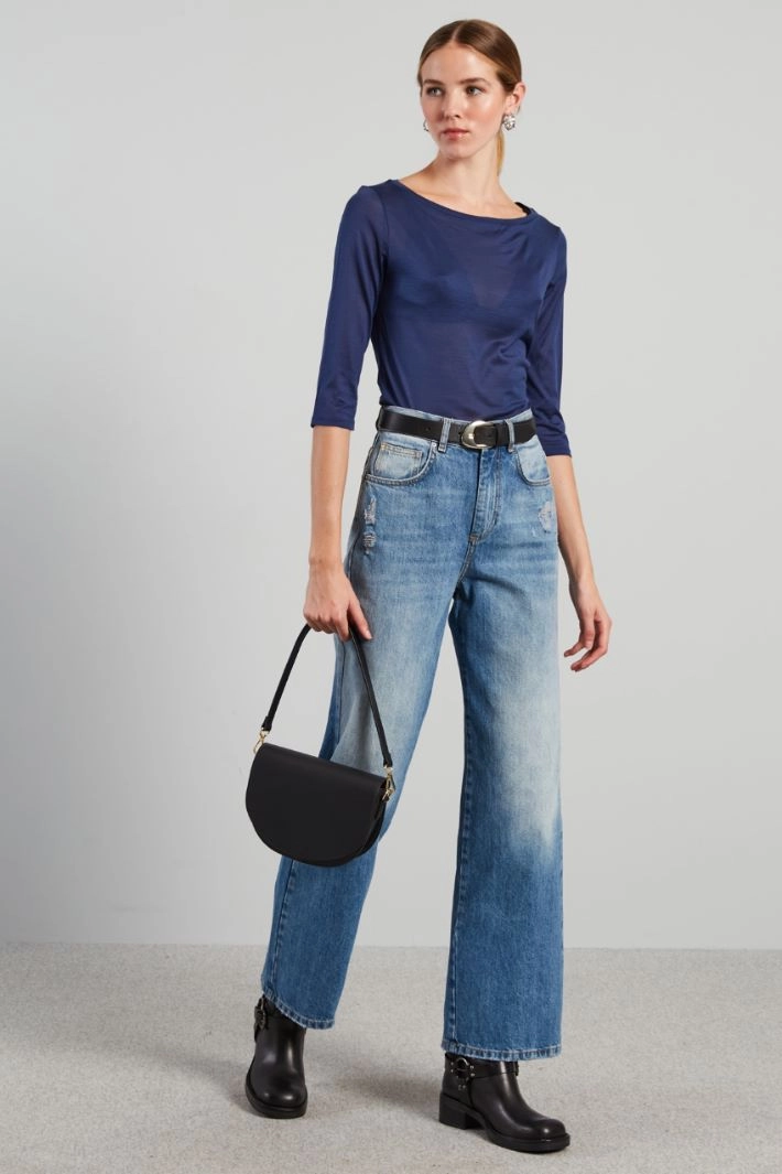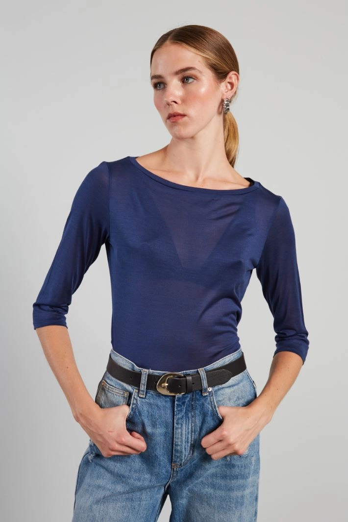 Regular fit T-shirt in yarn-dyed pure silk jersey, with boat neckline and three-quarter sleeves.