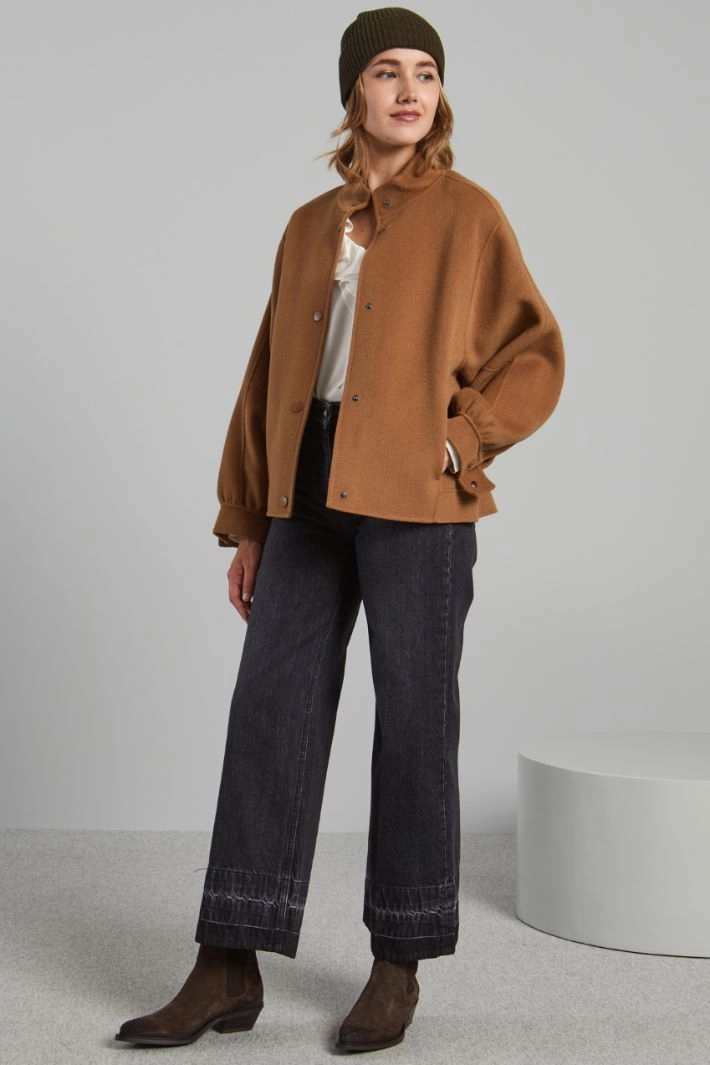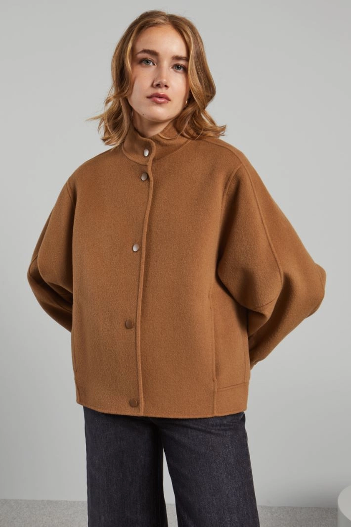 Straight-cut jacket in double wool blend cloth, with stand-up collar, long sleeves with cuff and button, inset side pockets. Single-breasted fastening with press studs. Unlined.