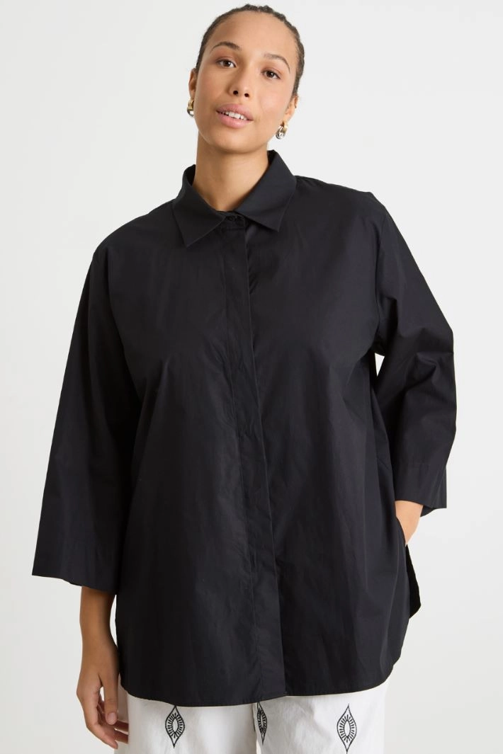 Wide, straight-cut tunic in cotton poplin, featuring a point collar, three-quarter sleeves, an inverted pleat on the back and side slits at the hem. Button fastening.