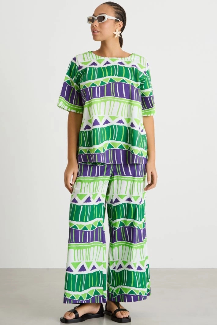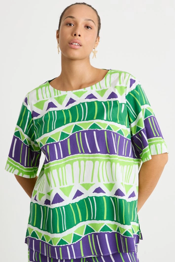 Loose-fit blouse crafted in stretch cotton poplin, with a round neckline, short sleeves and side slits at the hem. Keyhole button fastening at the back.