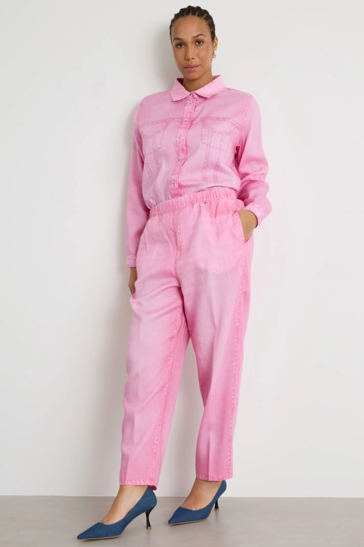A-line shirt crafted in denim-effect satin, featuring a pointed collar and long sleeves. Press-stud fastening.