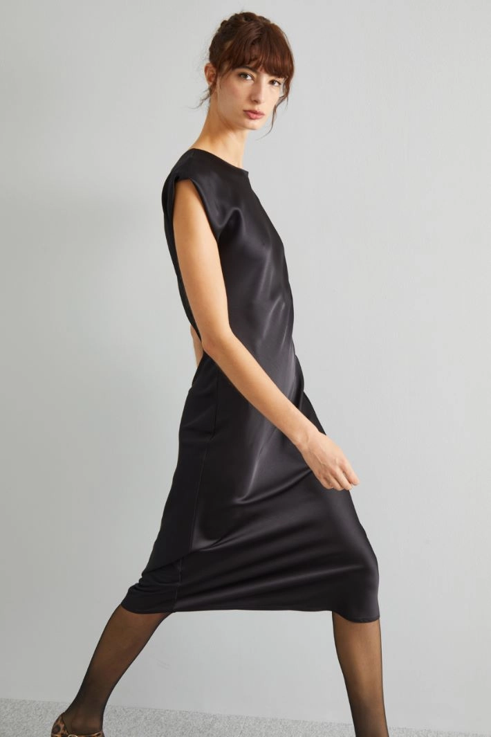 Fluid midi satin dress with a crew neckline at the front and V-neckline at the back, cap sleeves. Lined.
