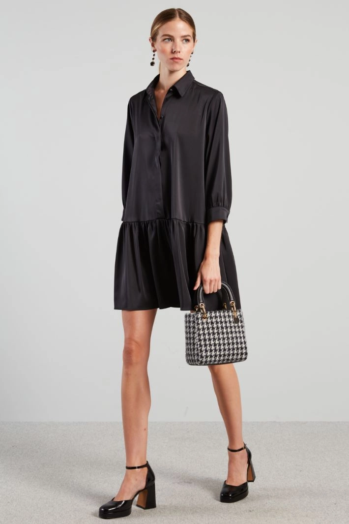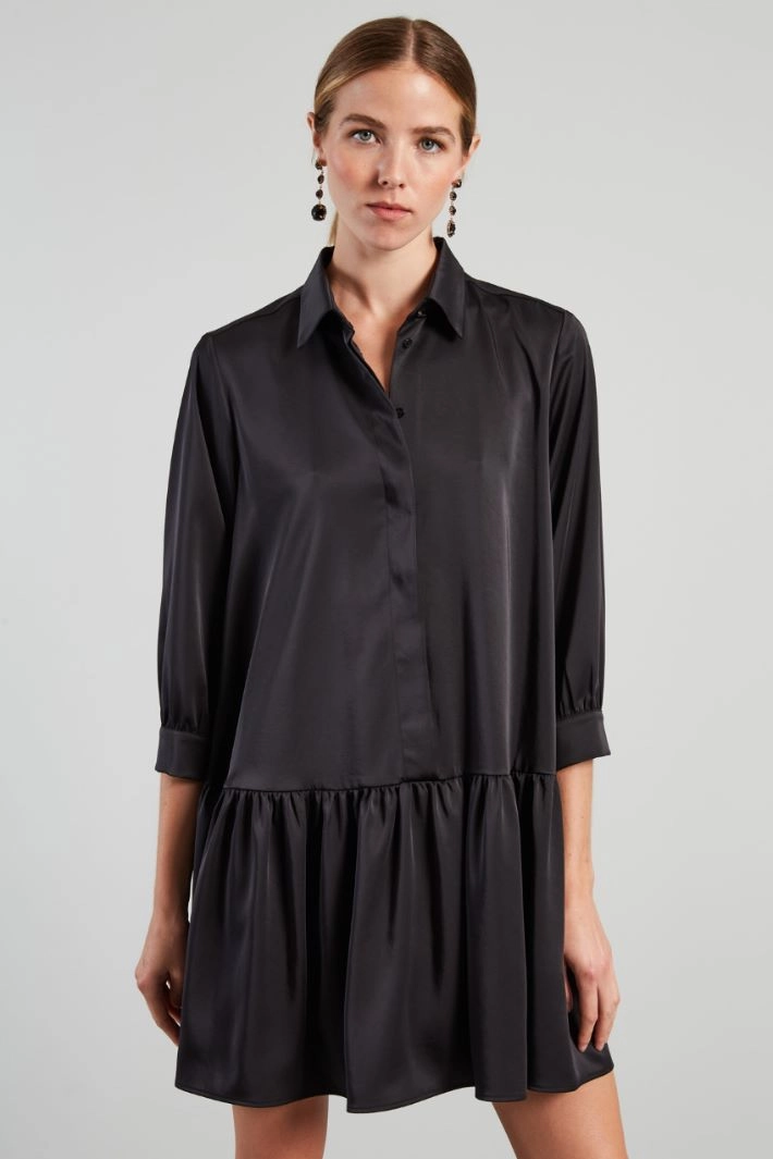 Short flared satin dress with shirt collar and long sleeves with cuff. Fastening with hidden buttons.