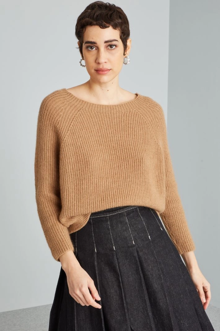 Loose fit sweater in ribbed mohair blend yarn, with round neckline and long raglan sleeves.