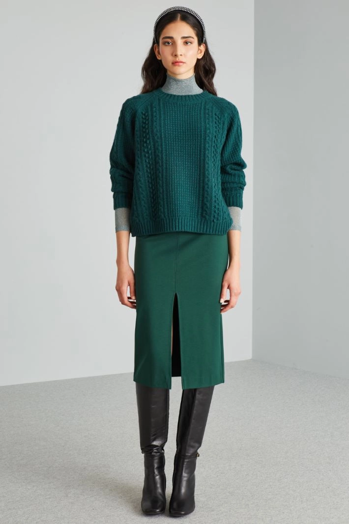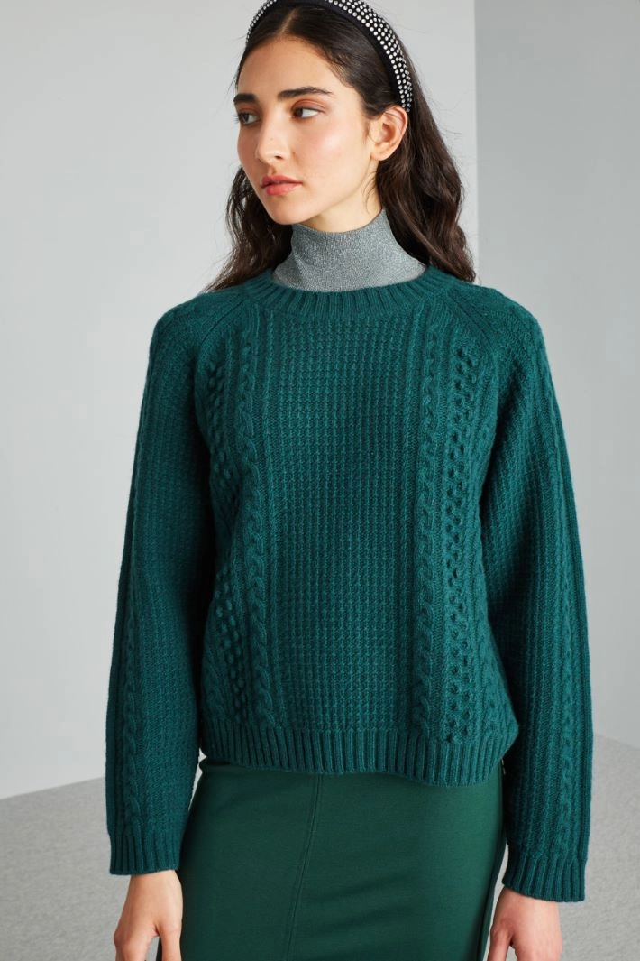 Crew neck sweater in pure wool yarn with long raglan sleeves and multi knit pattern.